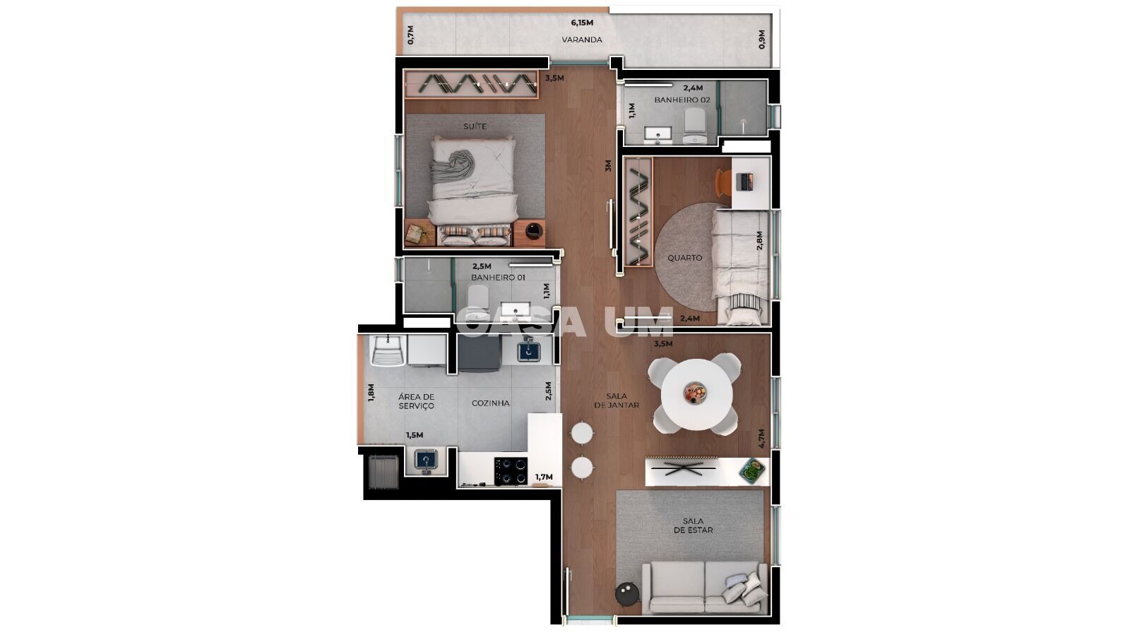 • Sala de estar e jantar integradas com a cozinha em conceito aberto, criando um ambiente moderno e acolhedor;