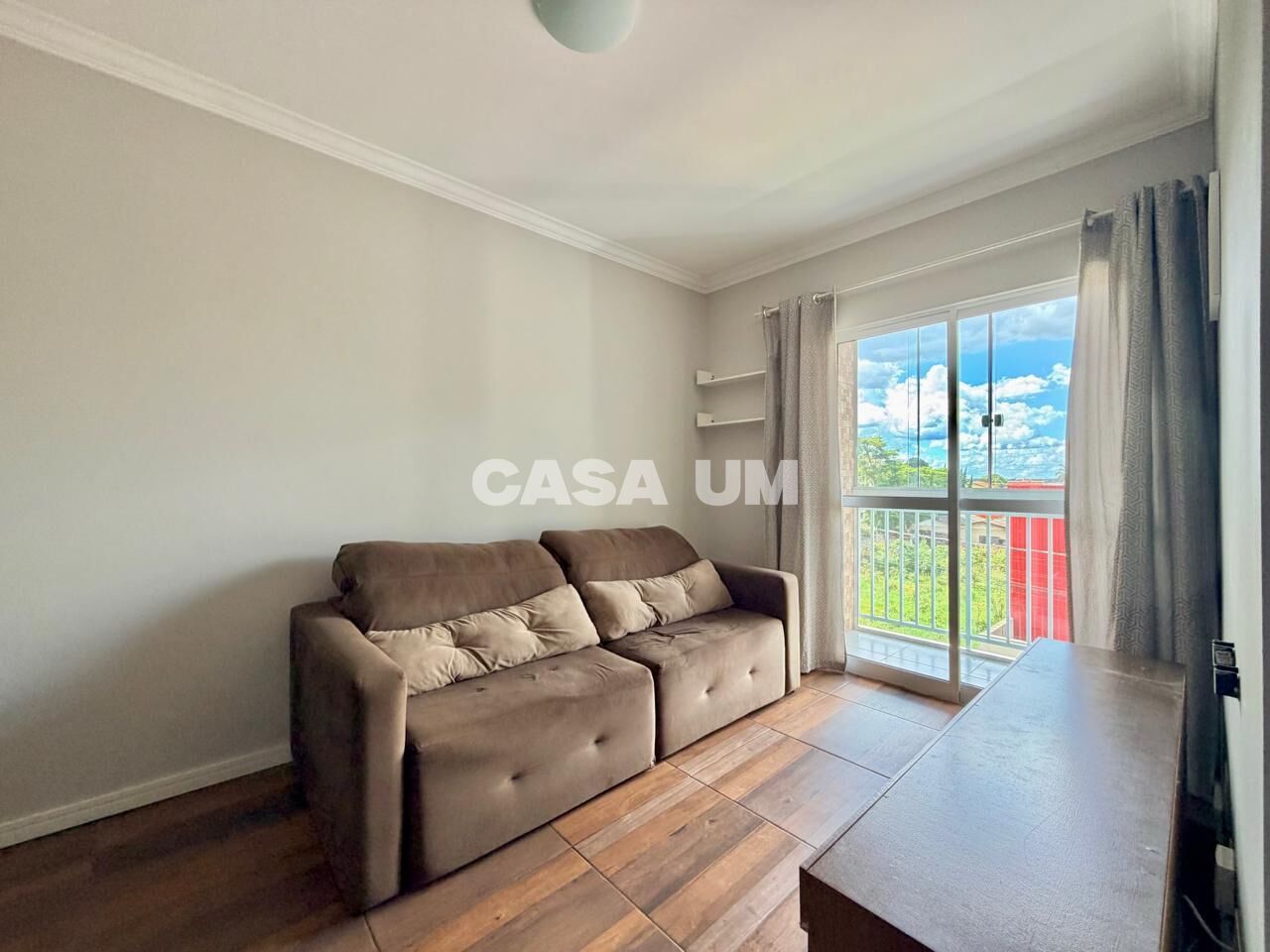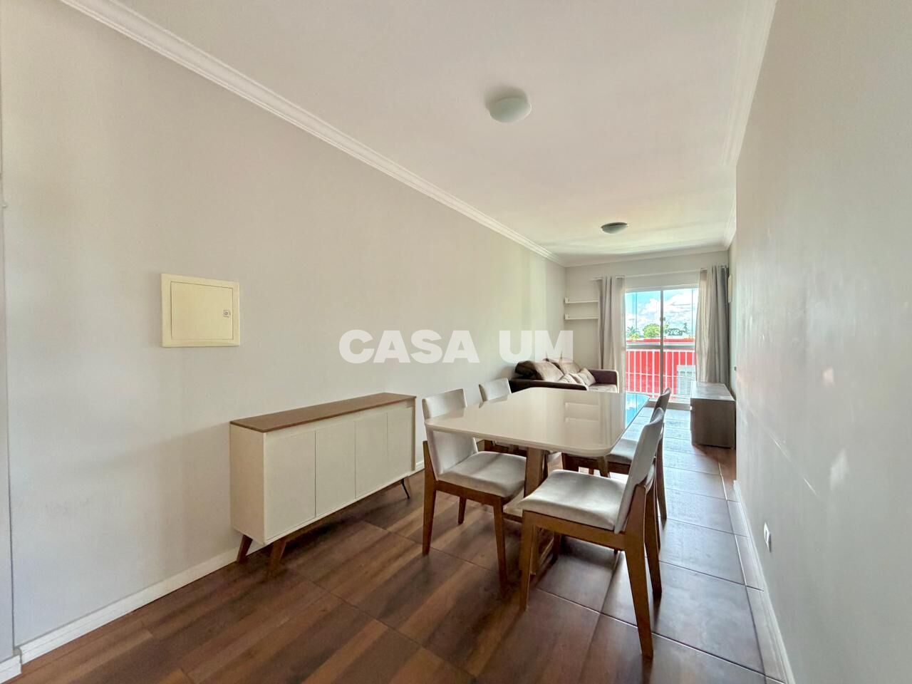 * Sala de estar e jantar integradas, já equipada com mesa, cadeiras, aparador, sofá e rack de TV;