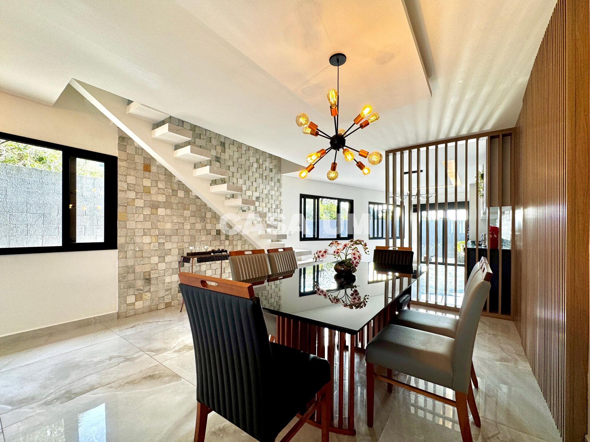• No 1 ° pavimento: sala de jantar, cozinha com móveis planejados, fogão cooktop, forno, microondas, lavabo, área de serviço e espaço de terreno;